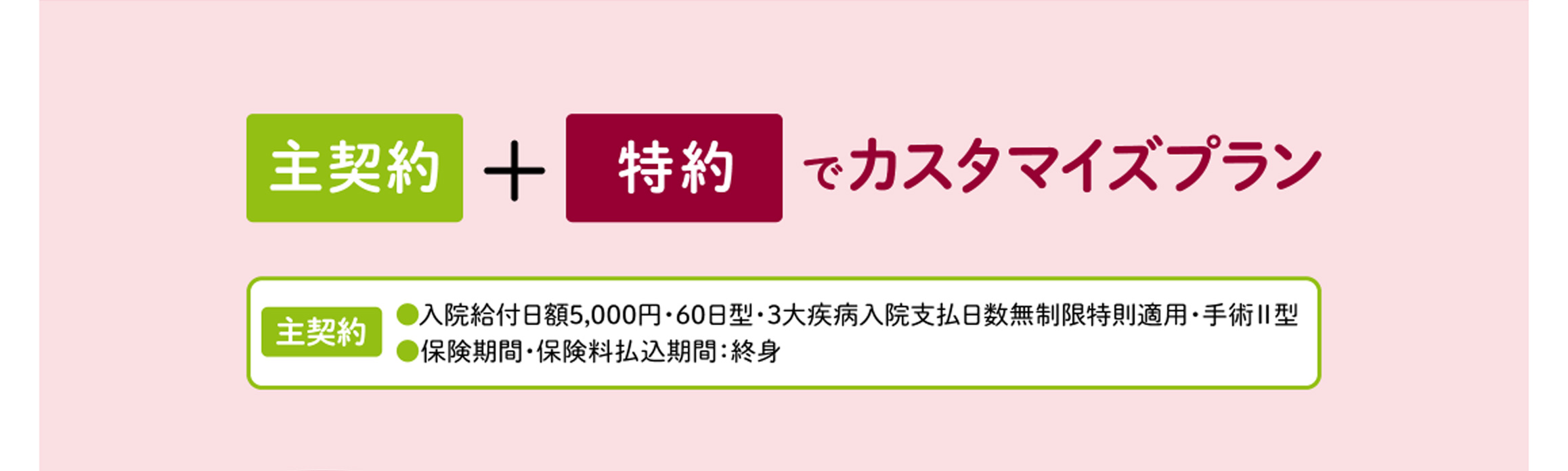 主契約+特約でカスタマイズプラン 主契約 入院給付日額5,000円・60日型・3大疾病入院支払日数無制限特則適用・手術Ⅱ型 保険期間・保険料払込期間:終身