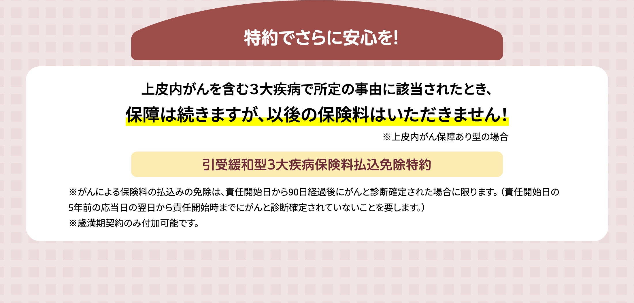 *がんによる給付金のお支払いや保険料の払込みの免除は、責任開始日から90日経過後にがんと診断確定された場合に限ります。(責任開始時前にがんと診断確定されていないことを要します。)